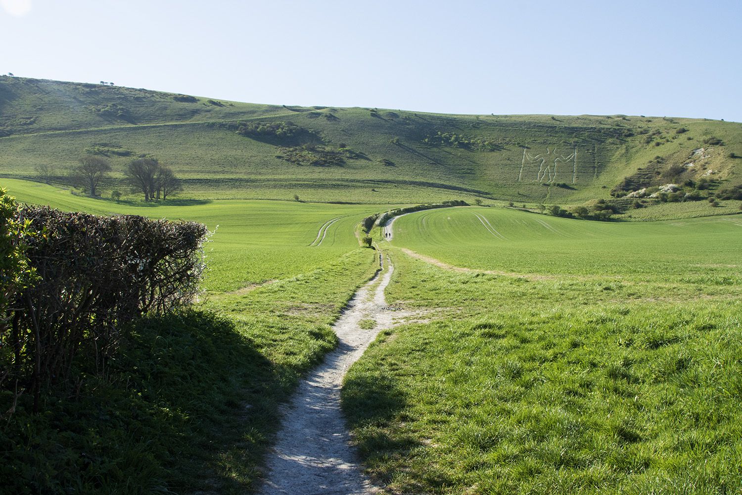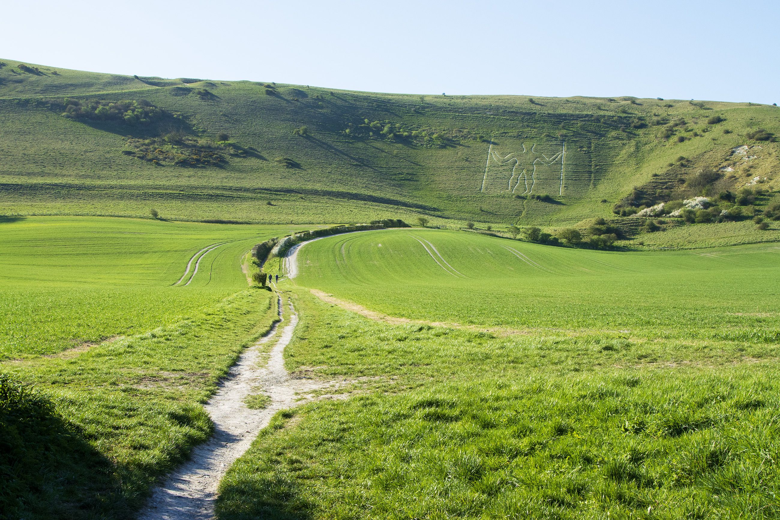 Litlington White Horse, a striking chalk hill figure in East Sussex. It sits on Hindover Hill, overlooking the Cuckmere Valley, and is one of only eleven horse hill figures in England outside of Wiltshire