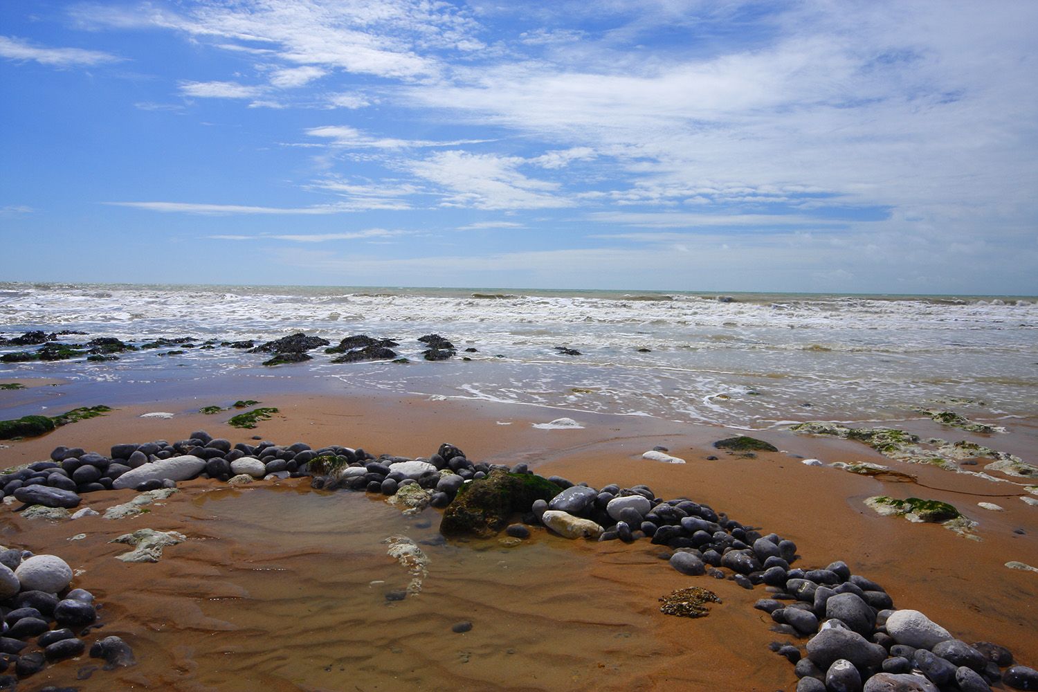 The beach itself is a mix of pebbles and sand, with rock pools revealed at low tide—perfect for a bit of fossil hunting or a quiet seaside stroll. Access is via a sturdy staircase from the cliff top, where you’ll also find a National Trust café, shop, and a row of historic coastguard cottages—some of which have already been lost to the sea due to ongoing coastal erosion.